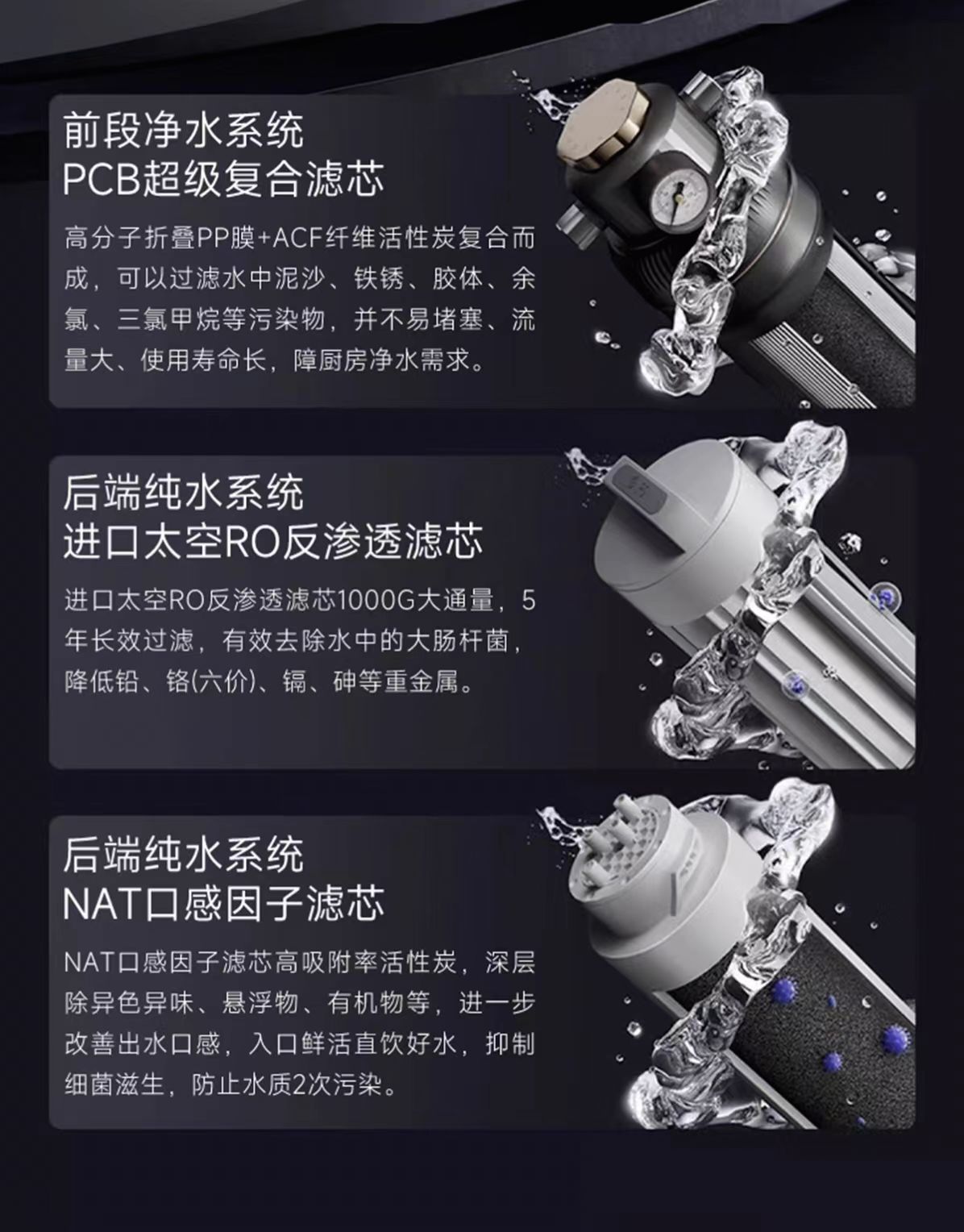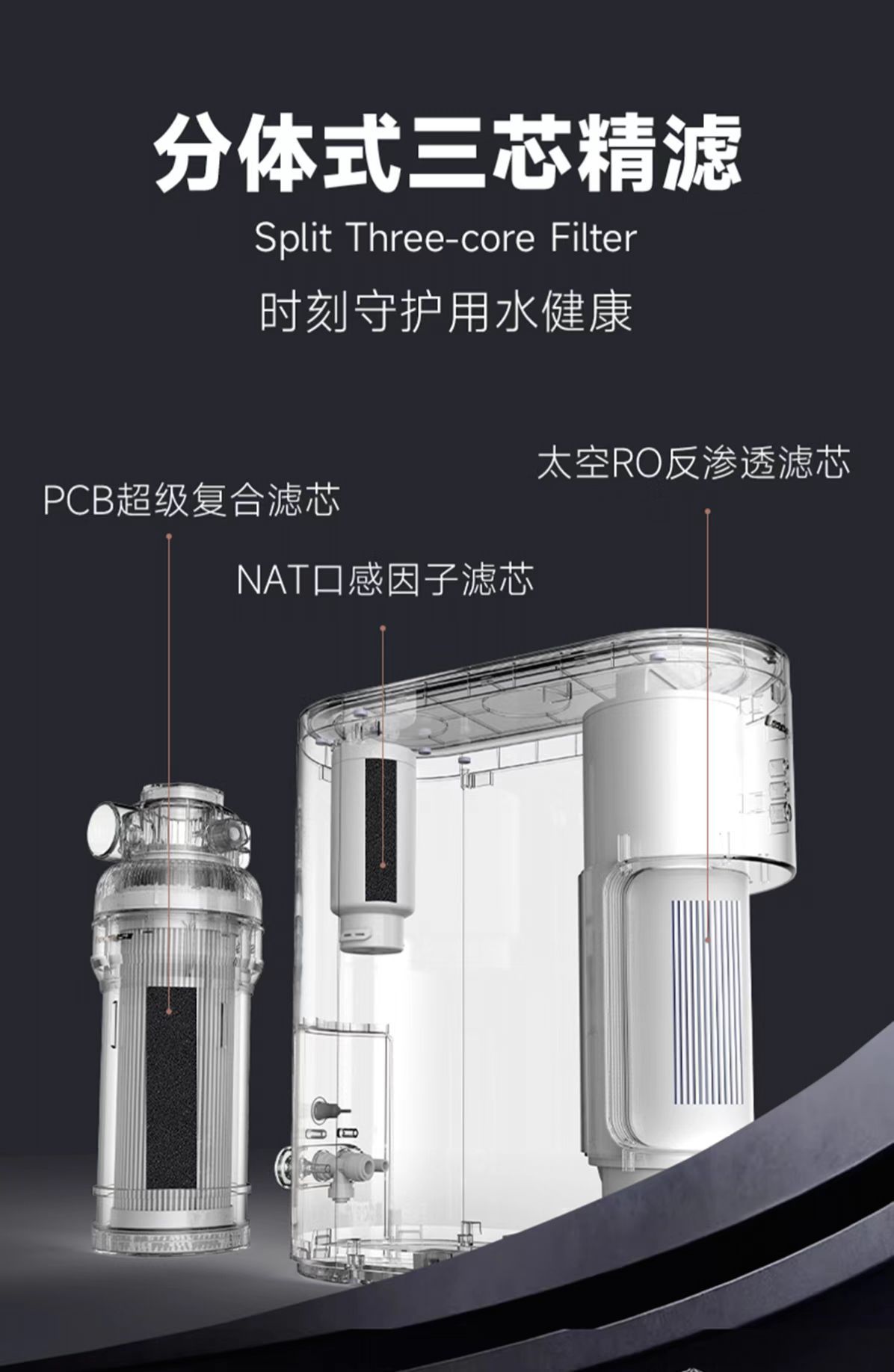 采用分体式三芯精滤,PCB复合滤芯、太空RO反渗膜、NAT口感因子滤芯层层净化,过滤精度达0.0001微米,能深度去除水中有害物质,每一口都是纯澈甘甜好水,老人小孩喝着都放心。
