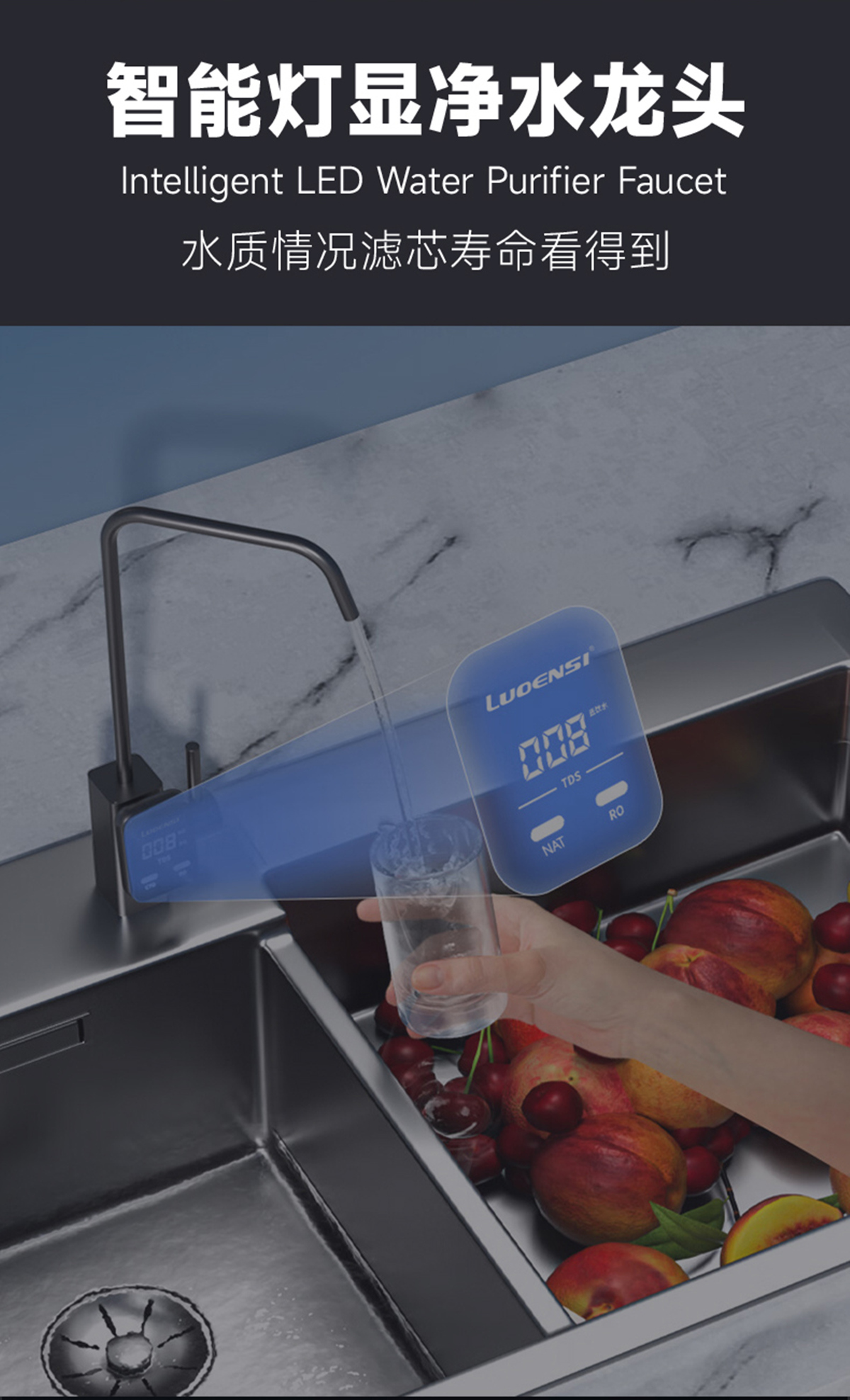 智能灯显净水龙头实时显示机器工作状态和滤芯使用情况,缺水、换芯自动提醒,还支持一键冲洗、检修功能,操作简单直观,维护更轻松。