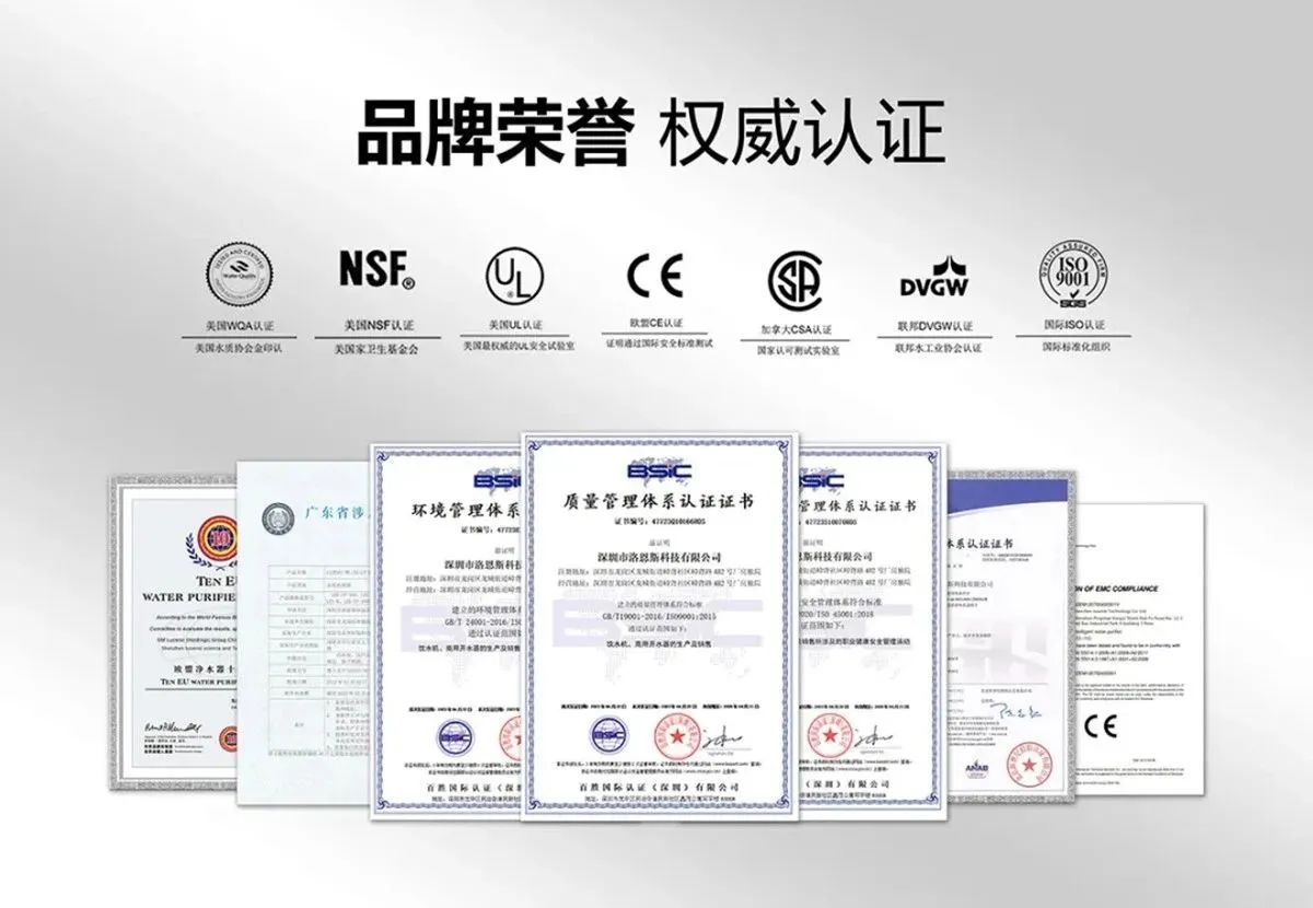 净水行业直接关乎用户健康,资质证书是品牌合规经营、产品可靠的“敲门砖”,有正规资质的品牌,不仅无法合法开展推广销售。真正有实力的品牌,必然在国内外权威认证中积累丰富荣誉,用资质证明产品硬实力。