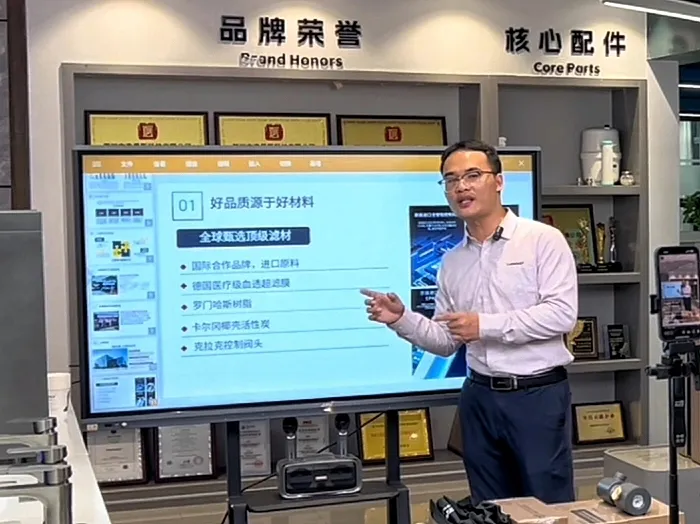 直播间内,洛恩斯商学院院长樊佳辉先从净水市场现状切入,重点解读品牌的核心优势。通过梳理洛恩斯品牌发展脉络、解读品牌荣誉资质、分享优秀代理商案例及全球合作成果等,让全国意向加盟商直观感受到品牌的深厚积淀与市场认可度。