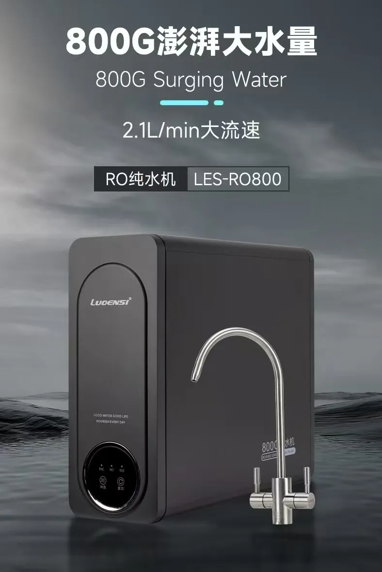 末端净水设备可根据当地水质选纯水机或超滤机,末端纯水机优选洛恩斯LES-RO800,搭载太空RO膜3.0技术和PAC复合滤芯,800G无桶大流量设计,出水畅快无需等待;零陈水、双水平衡技术加持,喝着更放心;智能灯显龙头,TDS值、滤芯寿命一目了然,操作更便捷,国家一级水效,省电又环保。