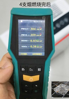 如图所示,香烟燃尽后,房间中央位置的PM2.5/PM10分别为304和359(μg/m³),此时室内的空气质量较低,属于严重污染状态。将空气净化器开至强力模式,静候10分钟。