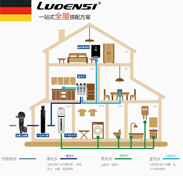 中国居民长期饱受用水难、水质差之苦,净水器的出现,极大改善了家庭用水环境。但随着人们对健康、品质生活的追求,单一品类的净水器已很难满足现代居家生活的净水需求,而洛恩斯全屋净水系统,早已完成净水器单品的高端品质化转型升级,可以实现家庭“饮”、“用”、“洗”、“浴”多场景水质净化,填补了市场空白。