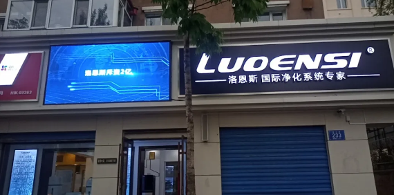 洛恩斯有着统一标准的企业形象,品牌logo组成的门头高端大气,国际品牌形象突出,强调了洛恩斯以全屋净水系统高端定制为主的品牌特点。