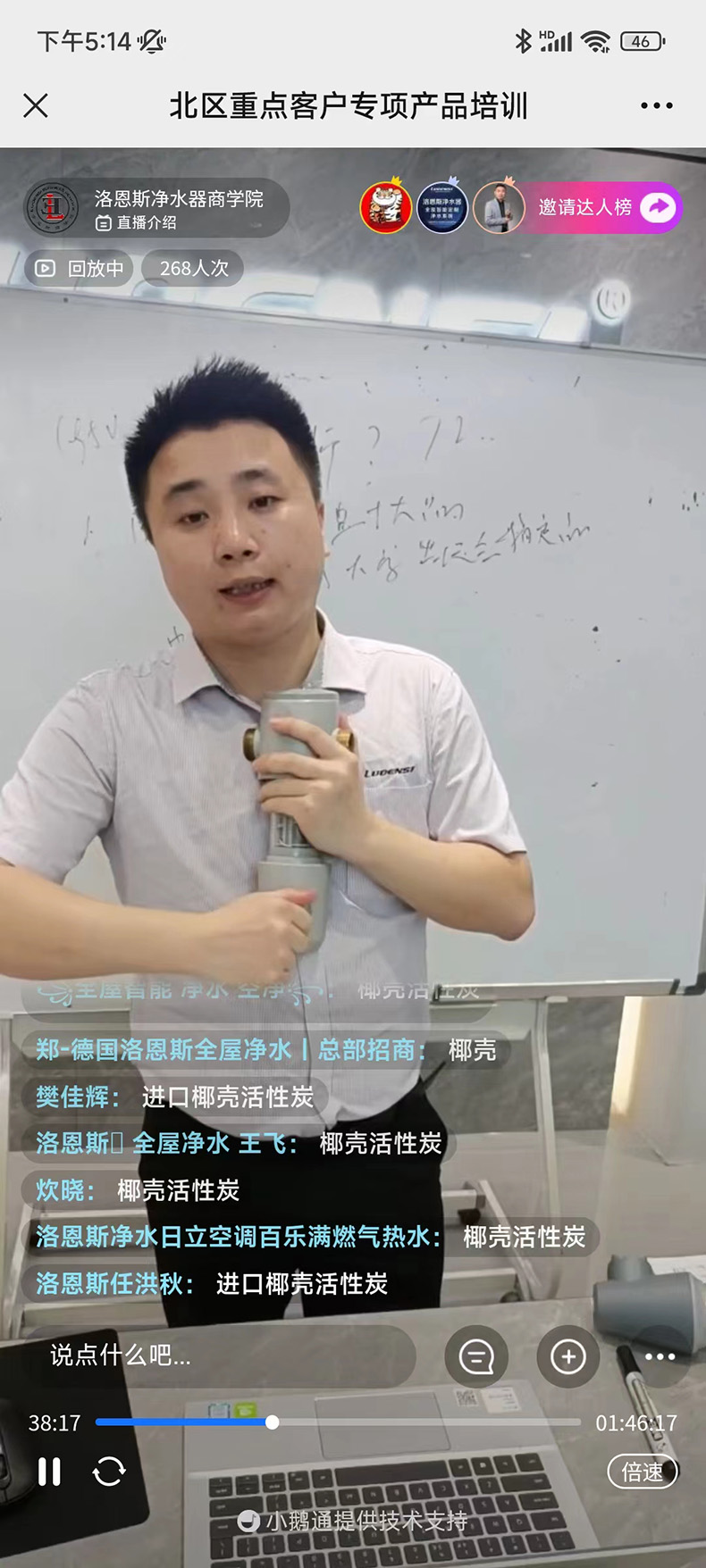 这次产品培训课由洛恩斯北区市场大区总监张总来主讲,培训内容是洛恩斯前置过滤器、中央净水、中央软水的优势、卖点和竞品分析。洛恩斯天津专卖店、洛恩斯山东济宁专卖店、洛恩斯山西太原专卖店、洛恩斯河北任丘专卖店、洛恩斯河南开封专卖店等几十家代理商参加了线上培训课。