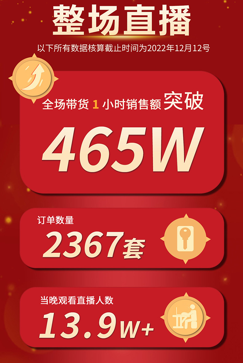 洛恩斯双十二活动取得了圆满成功,12月10号当晚直播人数达到了13万9千人,开播1小时订单数量达到了2367单,全屋净水下单231套,全场带货销售额突破465万元。