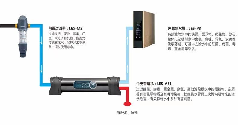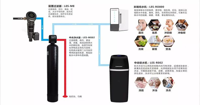 下面介绍洛恩斯产品系列组合搭配的三套全屋净水系统方案,根据户型及需要合理配置。