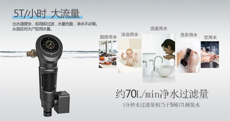 安装在入户主管道,过滤铁锈、泥沙、藻类、红虫、大分子有机物、保护涉水类设备、延长使用寿命,对后续安装的净水产品起到保护作用。