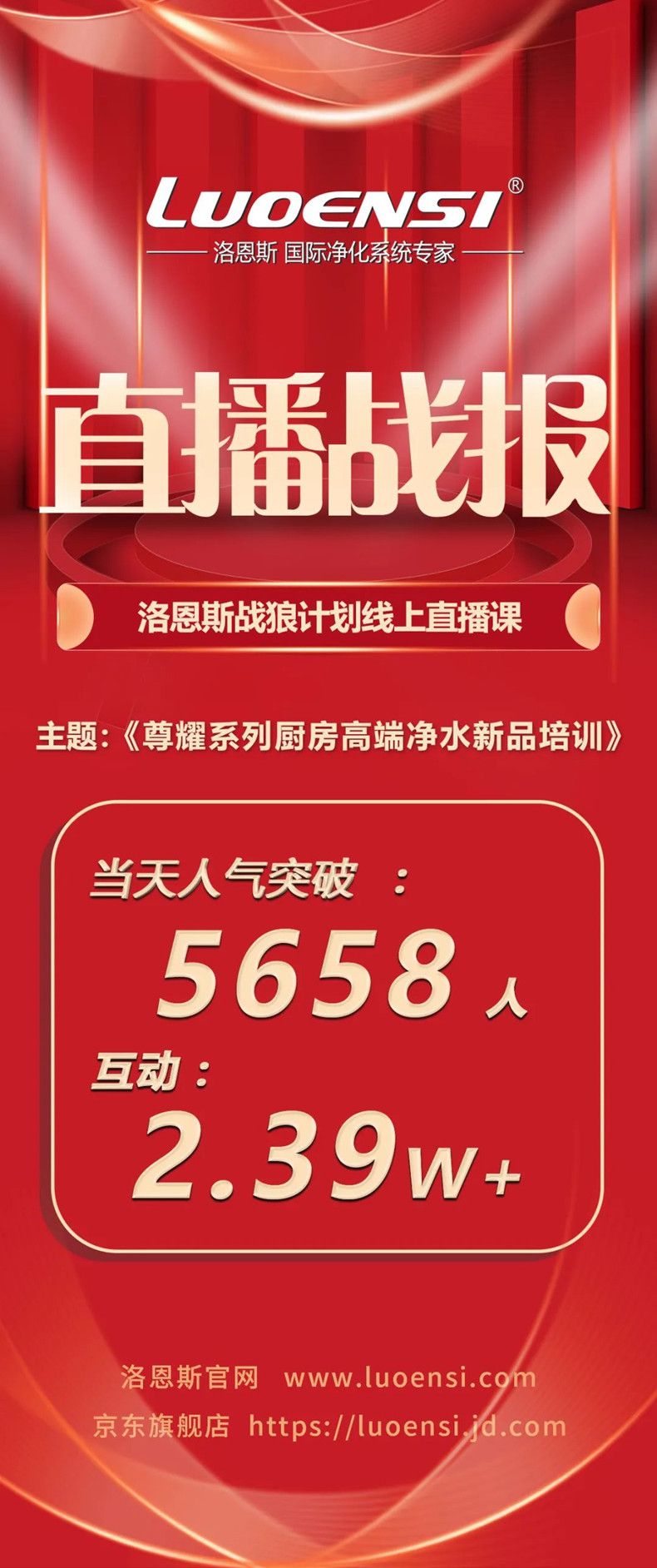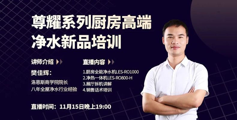 11月15日晚上7点,洛恩斯净水商学院战狼计划线上直播课开讲,这次课程的主题是“尊耀系列厨房高端净水新品培训”,由洛恩斯净水商学院院长樊经理主讲,吸引了很多洛恩斯代理商、经销商及净水器销售团队前来学习,人气值达到5658人,互动量达到2.39万次。