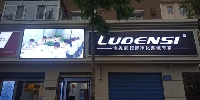 洛恩斯有着统一标准的企业形象,品牌logo组成的门头高端大气,国际品牌形象突出,强调了洛恩斯以全屋净水系统高端定制为主的品牌特点。