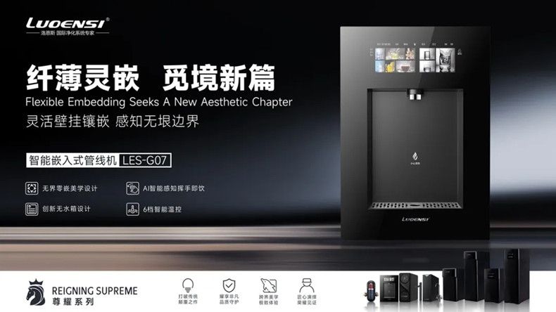 灵活壁挂镶嵌,感知无垠边界。洛恩斯智能嵌入式管线机LES-G07机身仅78mm纤薄设计,零嵌式安装,重新定义餐厨美学,无水箱设计,AI智能感知挥手即饮,6档水温选择,满足个性化饮水需求,3档水量一触随心。