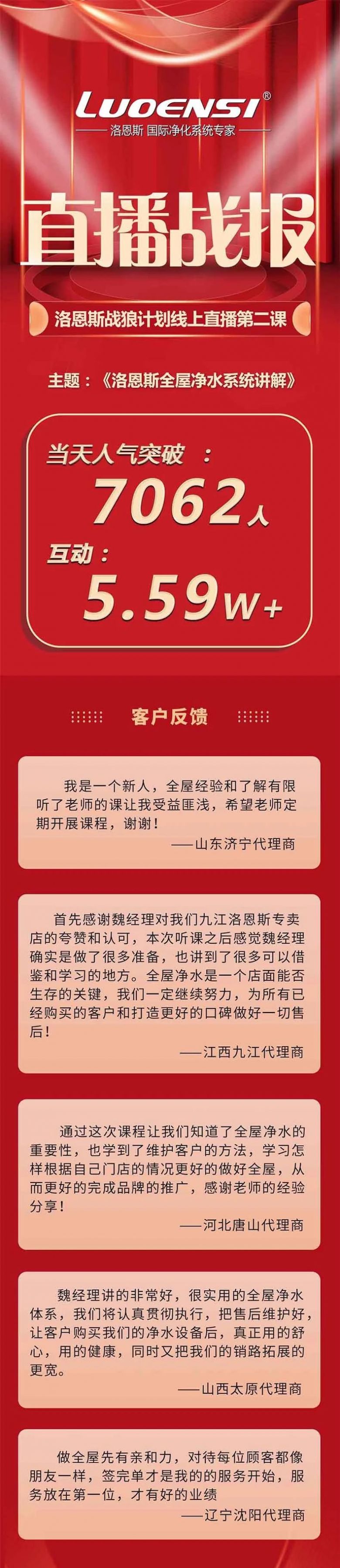 5月16日晚上7点,洛恩斯净水商学院战狼线上直播课开讲,这次课程的主题是“洛恩斯全屋净水系统讲解”,由洛恩斯全屋净水西区市场大区魏经理主讲,吸引了很多洛恩斯代理商、经销商及净水器销售团队前来学习,人气值达到7062人,互动量达到5.59万次。