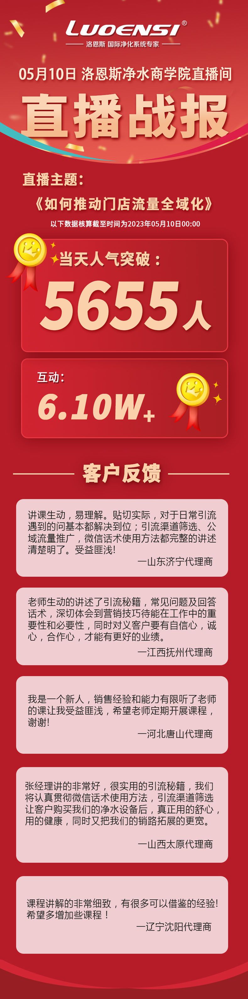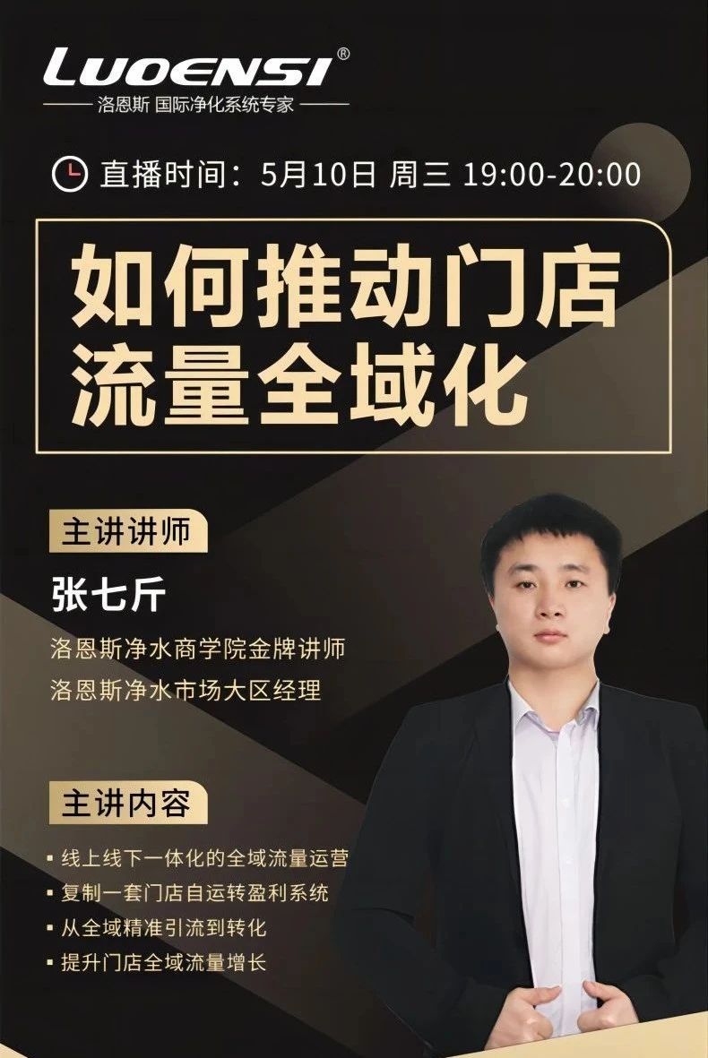 洛恩斯品牌1950年成立于德国汉堡,七十余年专注净水,在市场上广受好评,是国际净水器行业“专业性强、品质好、产品性价比高”的代名词。而洛恩斯净水器的成功离不开数以千计奋 斗在市场一线的代理加盟商朋友,为了更好的提升洛恩斯净水器代理加盟商的终端市场竞争力,洛恩斯在2022年10月15日,率先行业成立以市场销售为主,产品知识培训为辅的专业商学院,商学院一经成立立刻受到洛恩斯全国代理加盟商的高度关注。5月10日晚上7点,洛恩斯净水商学院战狼线上直播课开讲,这次课程的主题是“如何推动门店流量全域化”,课程由洛恩斯市场部北区张总监主讲,课程吸引了很多洛恩斯代理商、经销商及净水器销售团队前来学习,人气值突破5655人,互动量达到6.10万次。