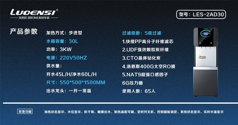 洛恩斯步进式高端商务机LES-2AD30采用洛恩斯400G太空RO膜、洛恩斯NAT纳米复合过滤技术,NAT9超强口感因子改善水质口感。整体双面静电喷涂磨砂黑,钢化玻璃面板,坚固防刮,实时水温显示,无线遥控微电脑数字程序控制加热温度可调防烫伤 。单台饮水机课间10分钟净水可连续供水30L,按照250mL/杯水计算,可超过百杯,保障了学生下课期间的饮水需求。