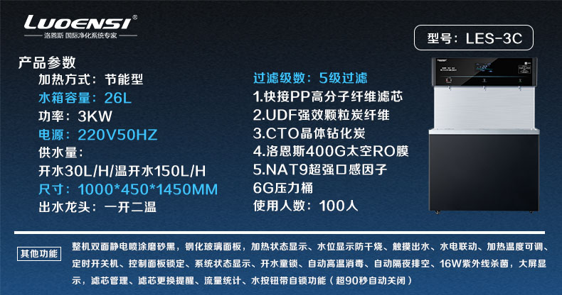 洛恩斯节能型轻奢校园直饮机LES-3C使用洛恩斯400G太空RO膜、洛恩斯NAT纳米复合过滤技术,NAT9超强口感因子改善水质口感。304食品级涉水部件,保证水质安全卫生。采用高效热交换技术及时将开水冷却成温开水,同时将进水加热成80度左右的热水,饮用温开水,无需等待。8寸液晶彩屏显示,无线遥控微电脑数字程序电子感温控制。