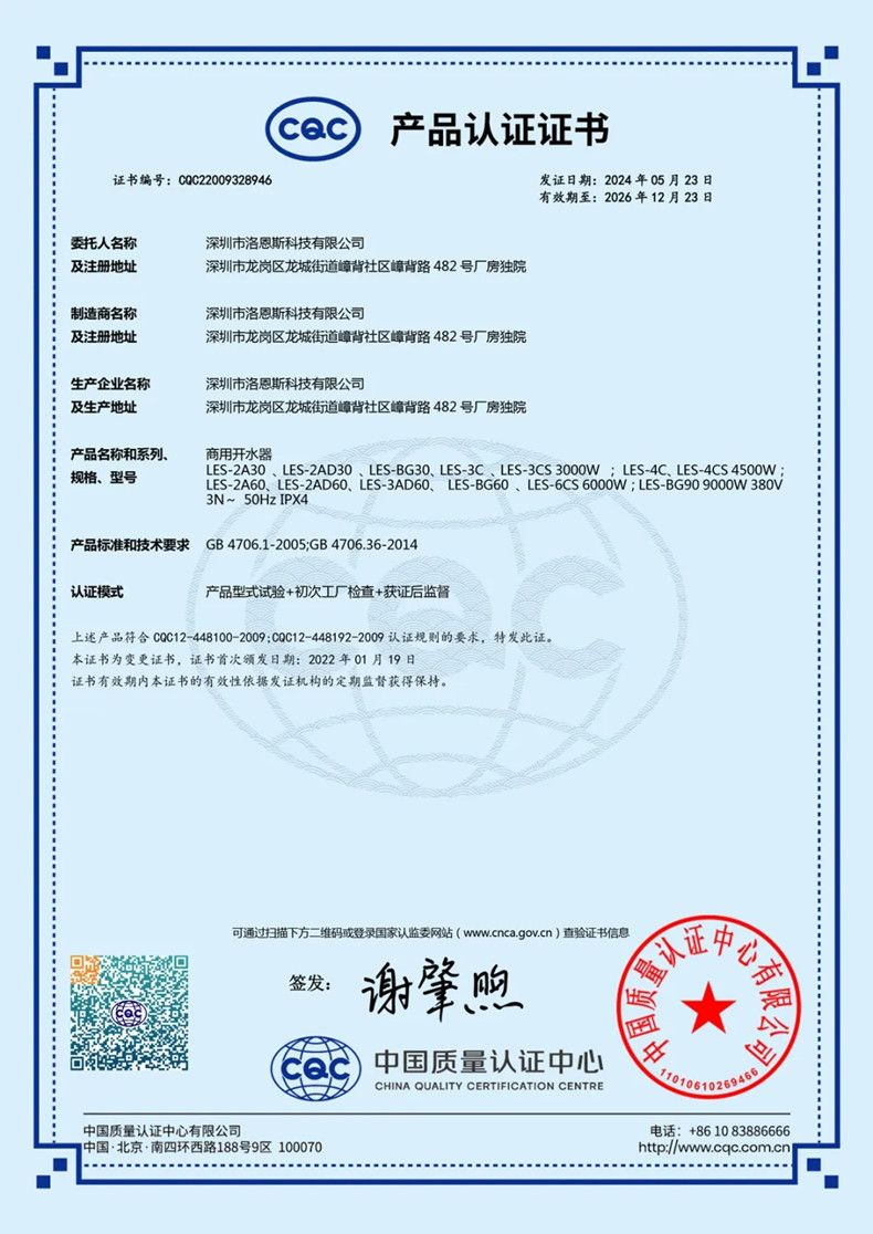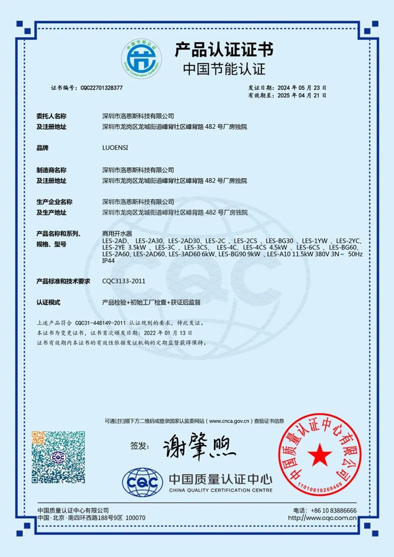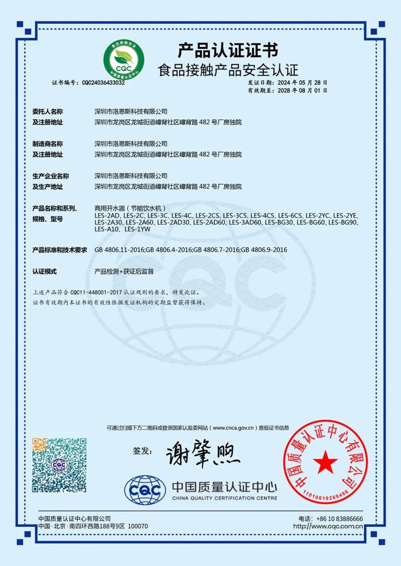 2024年5月23日,洛恩斯全屋净水再获四项国家认证,中国质量认证中心通过对洛恩斯产品的权威检测,授予洛恩斯“CQC产品认证证书”、“CQC中国节能认证证书”、“CQC食品接触认证证书”与“3C认证证书”。