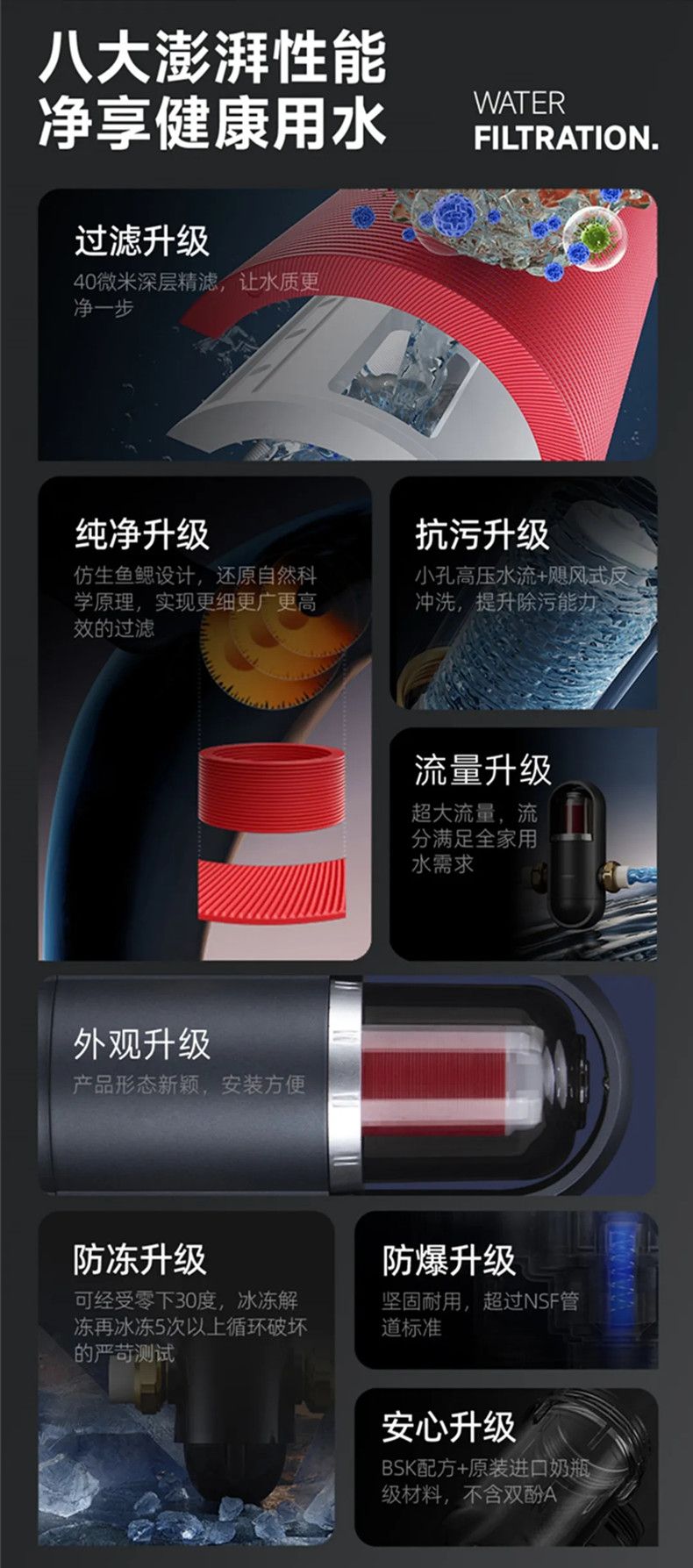 ●过滤升级:40微米深层精滤,让水质更净一步