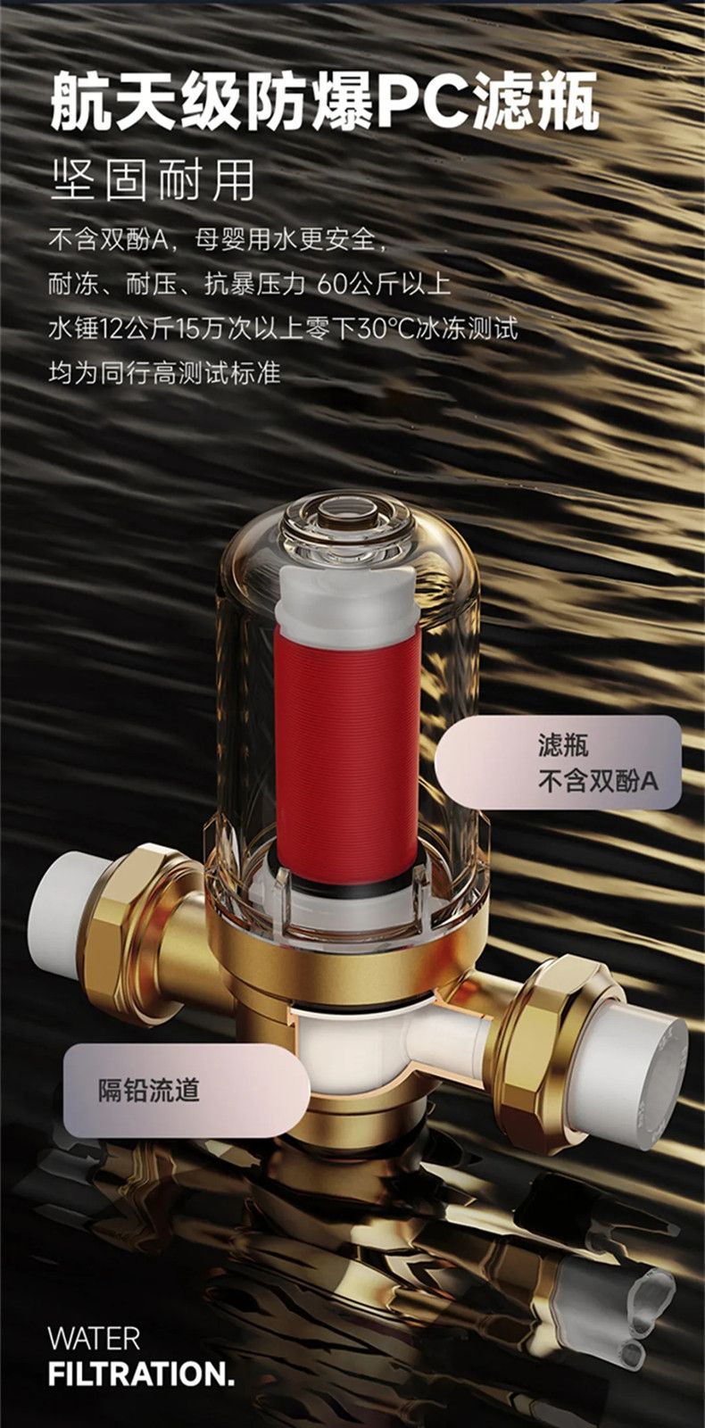 坚固耐用,不含双酚A,母婴用水更安全,,耐冻、耐压、抗暴压力 60公斤以上,水锤12公斤15万次以上,零下30°C冰冻测试,均为同行高测试标准,滤瓶不含双酚A。