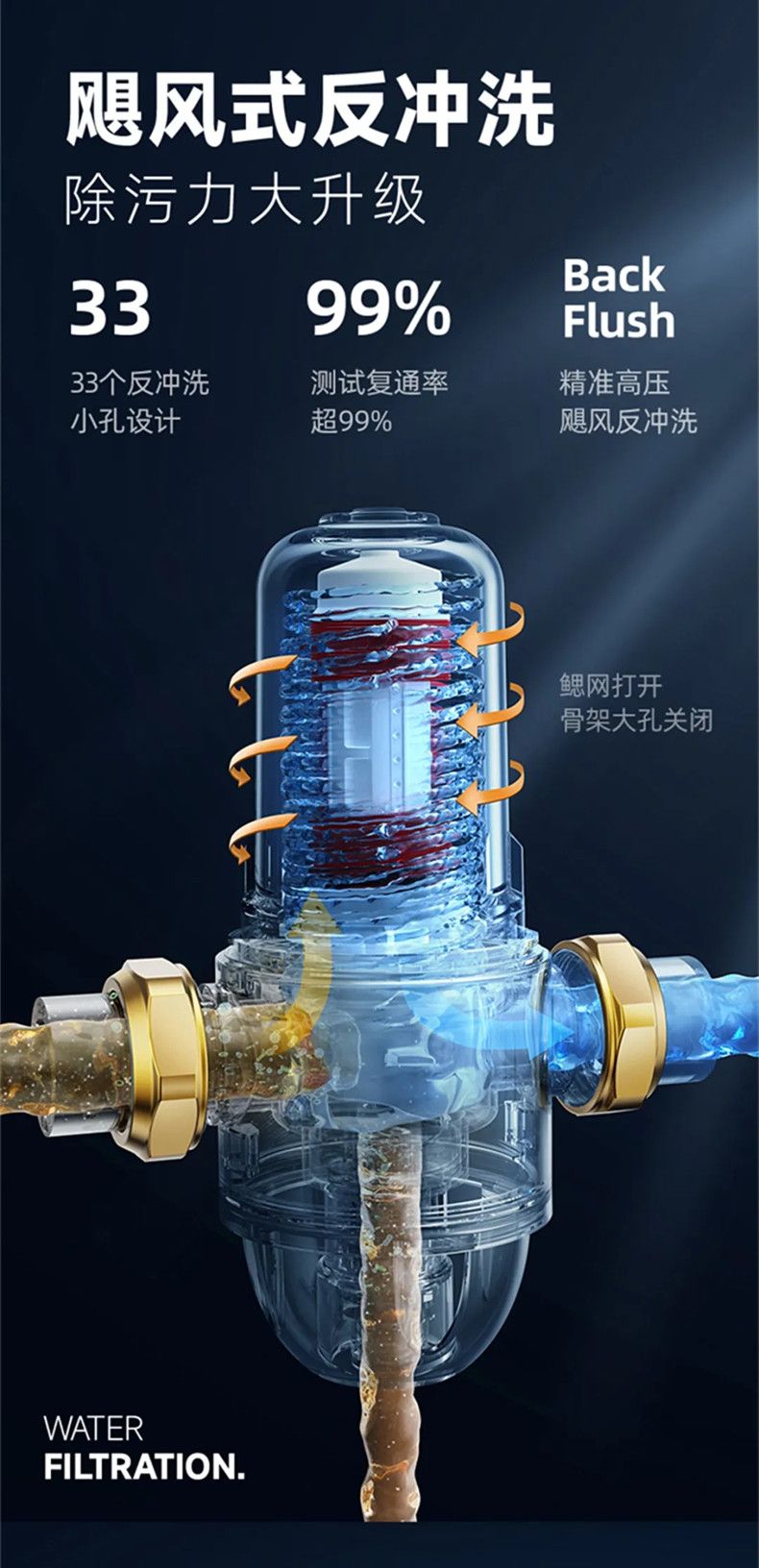 排污时叠片松开,水流道改变,由内而外高压飓风反冲洗,通过自来水的压力由滤网的内壁渗透到外壁,泥沙、铁锈等颗粒型杂质被截留于管内,打开冲洗阀门被滤网所截留的杂质被水冲走,排污更彻底。如果遇到水质比较差、消费者长时间不冲洗,堵住了也不用担心。通过反冲洗开关使活塞运行至下部,改变水流的方向转为“外压式”嵌在滤芯表面被顺冲冲不掉的杂质,被反向运行的水冲走。