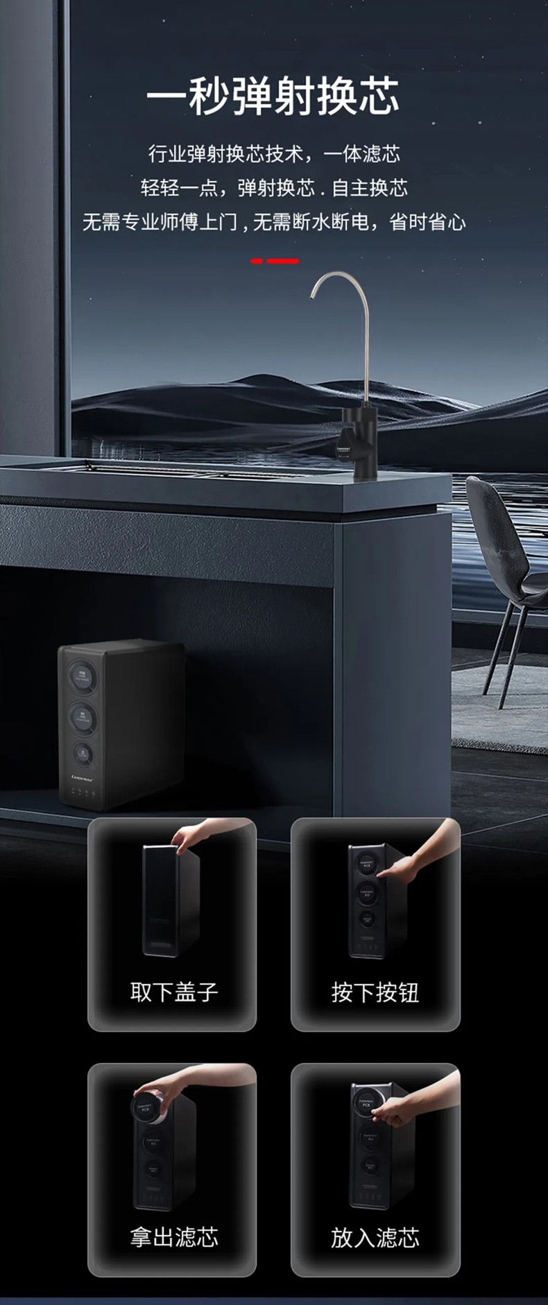 在高温天气下,细菌更容易繁殖,而滤芯正是细菌以及其它脏东西大集合的地方。虽然在滤芯强大、细密、全方位的拦截作用下,这些污染物可以被过滤。然而,一旦超过了滤芯的使用期限、污染物积累程度超出了滤芯的拦截限度,就会导致机器产水量降低,水质变差。任何一款净水器都必须定期更换滤芯,每款净水器都由不同的滤芯组成,而每个滤芯的寿命又不尽相同,在购买时要询问清楚。洛恩斯全屋净水器采用一秒弹射换芯技术,用户可自主换芯,无需专业师傅上门,无需断水断电,省时省心,持续净化水质安全与健康。