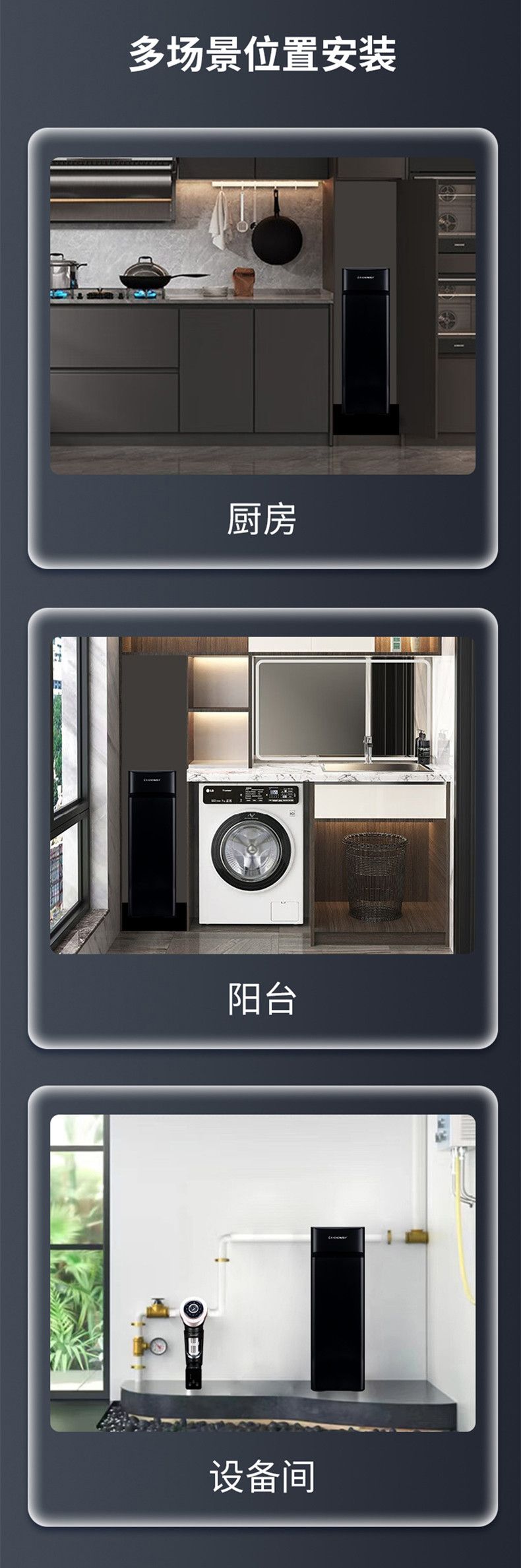 纤薄机身,轻巧体积,中央净水器大小尺寸可选择,灵活适应各种安装环境,如厨房、阳台、设备间等。