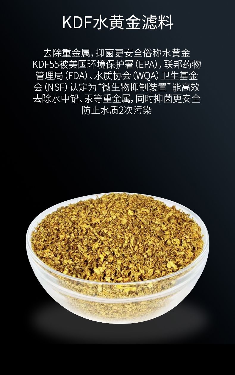 用心的滤料选择,只为更出色的净化效果!去除重金属,抑菌更安全,俗称水黄金。KDF55被美国环境保护署(EPA,联邦药物管理局)(FDA)、水质协会(WOA)卫生基金会(NSF)认定为“微生物抑制装置”,能高效去除水中重金属、硫化氢、六价铬、砷等有害物质,抑制水中各种微生物繁殖,降低水垢结成。KDF介质能够保护这些昂贵易损的水处理组件不受氯、微生物、结垢的影响。