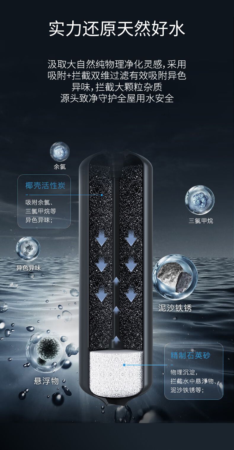 汲取大自然纯物理净化灵感,采用吸附+拦截双维过滤,有效吸附异色异味,拦截大颗粒杂质,源头致净,守护全屋用水安全。