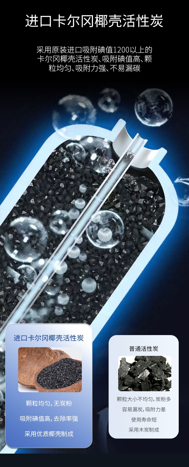 采用原装进口吸附碘值1200以上的卡尔冈椰壳活性炭,吸附碘值高、颗粒均匀、吸附力强、不易漏碳。高效去除水中余氯,避免余氯被皮肤或口腔摄入,去除异色异味,抑制细菌生长。进口卡尔冈椰壳活性炭去除率强,采用优质椰壳制成,而普通活性炭颗粒大小不均匀,炭粉多,容易漏炭,吸附力差,使用寿命短,采用木炭制成。
