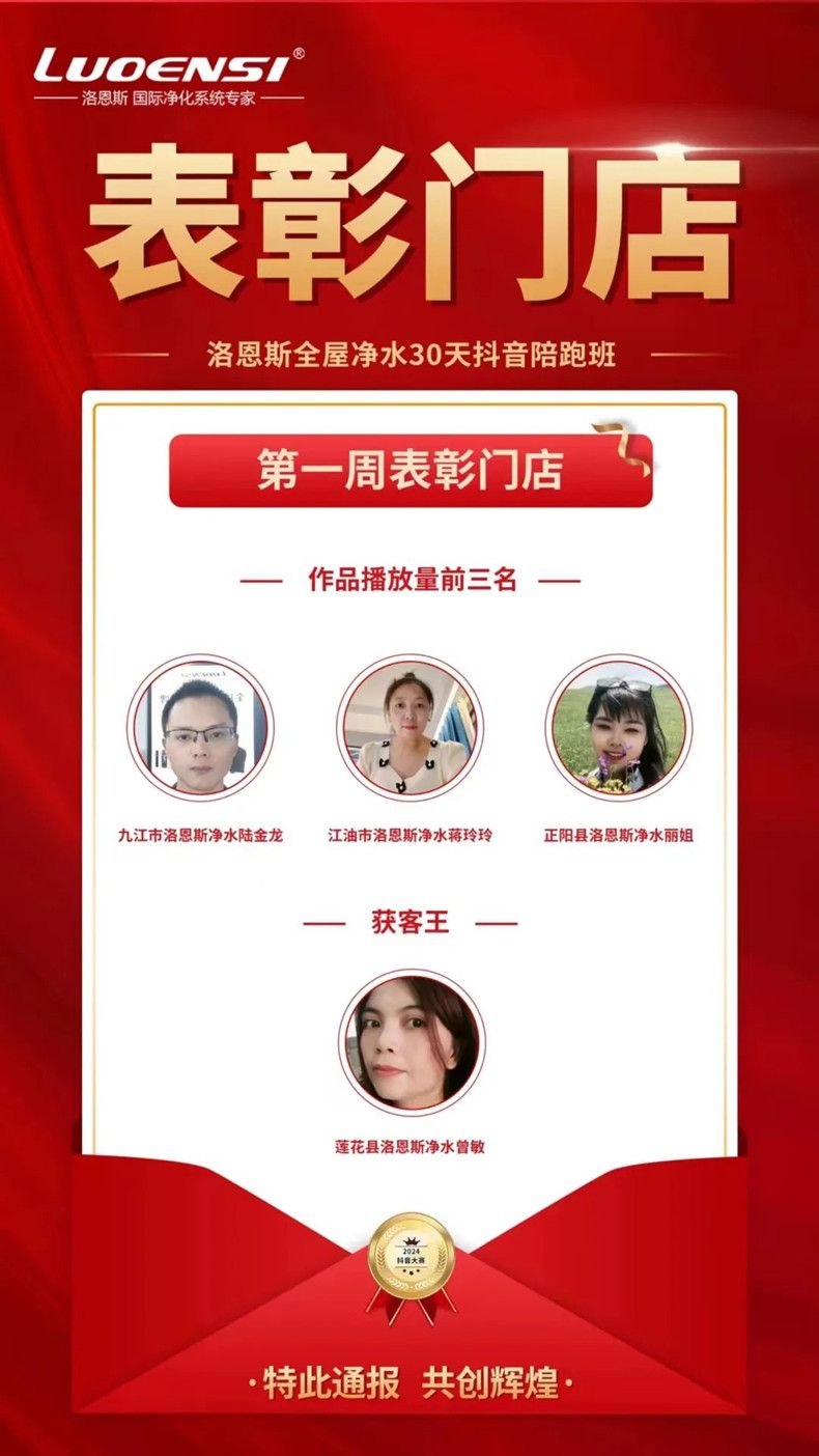 为了表彰那些勤学苦练的洛恩斯家人们,本次培训还以周为单位特别设立了“积分王”和“获客王”两项奖励,并授予奖金,以此激励他们不断前行,提升自己。积分王根据积分值从高到低排名,获客王按照客户后台留言咨询,以客户留手机号码或者微信号为准。在训练营期间,有不少学员表现优异,给其他学员起到了模范作用。本周线上陪跑训练营的获客王是洛恩斯全屋净水江西萍乡莲花县专卖店代理商曾总,本周作品播放量前三名是江西九江市洛恩斯净水陆金龙、四川江油市洛恩斯净水蒋玲玲、河南驻马店正阳县洛恩斯净水丽姐。他们的努力不仅为自己和团队赢得了荣誉,也激励着其他人追求卓越,实现账号的精准运营。