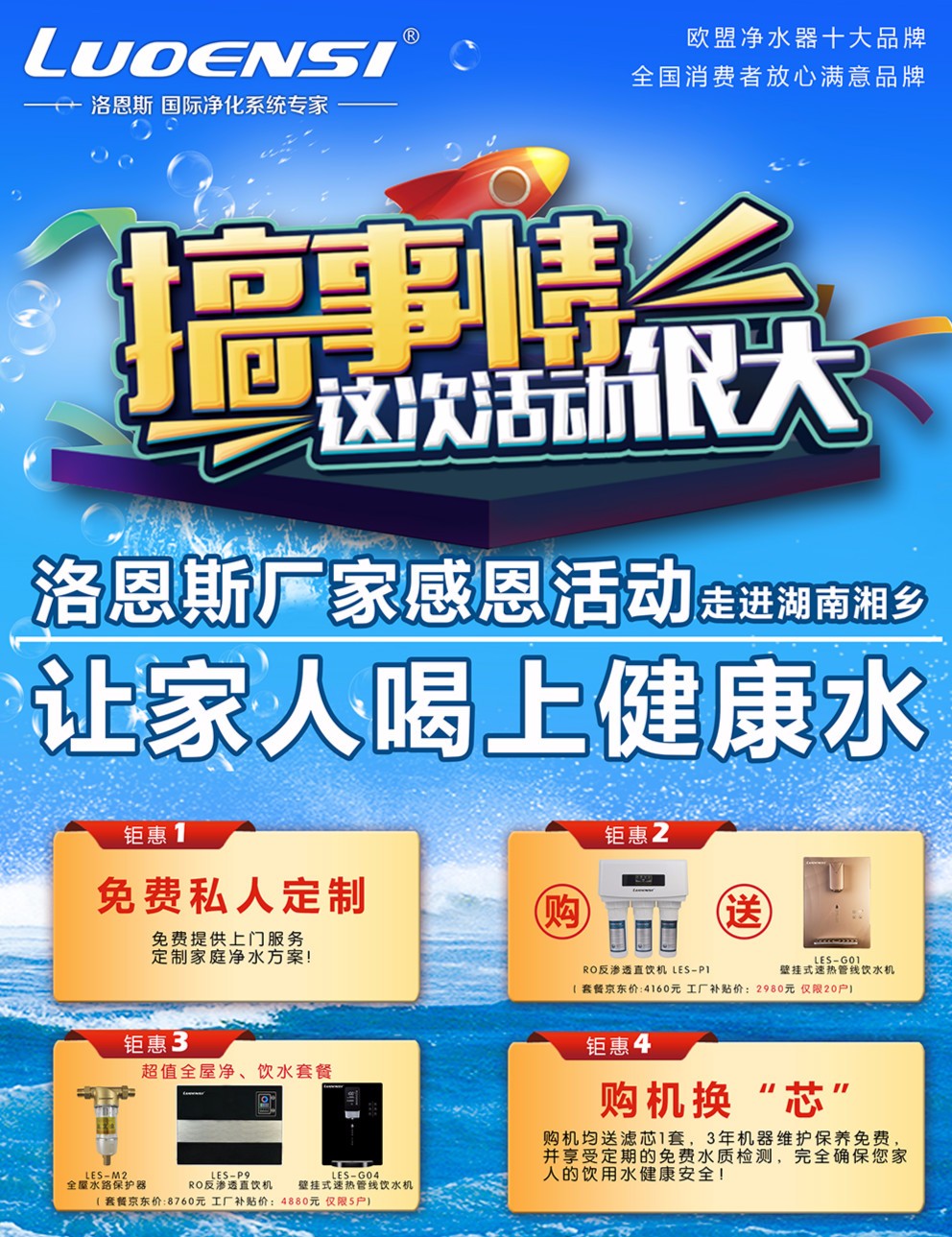 炎炎夏日,净水器销售火爆。德国洛恩斯全屋净水强势入驻湖南湘乡美巢家居建材城,为感恩回馈新老客户,洛恩斯湘乡美巢净水体验店倾情大放送,精彩好礼送不停!