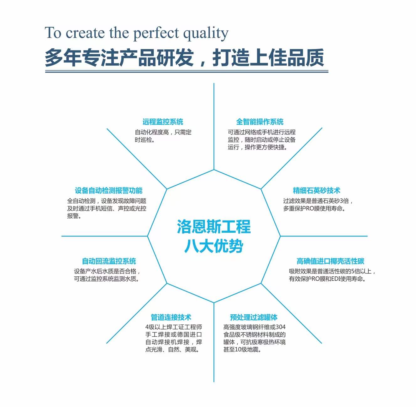 生物制药用水与化妆品行业用水系统遵循模块化设计理念,以预处理、氧化消毒、多介质过滤RO反滲透,U消毒、ED连续去窗子和储存外输等功能单元为基础,在设计、制造调试过程中以先进的技术精湛的工艺和严格的质量控制贯彻到每个功能单元;最终产水装置根据其用水标准的不同,经由各功能模块优化组合而成,从而保证了整个系统的高性能与高质量,使产成水完全达到或超过纯化水和注射用水的水质标准。